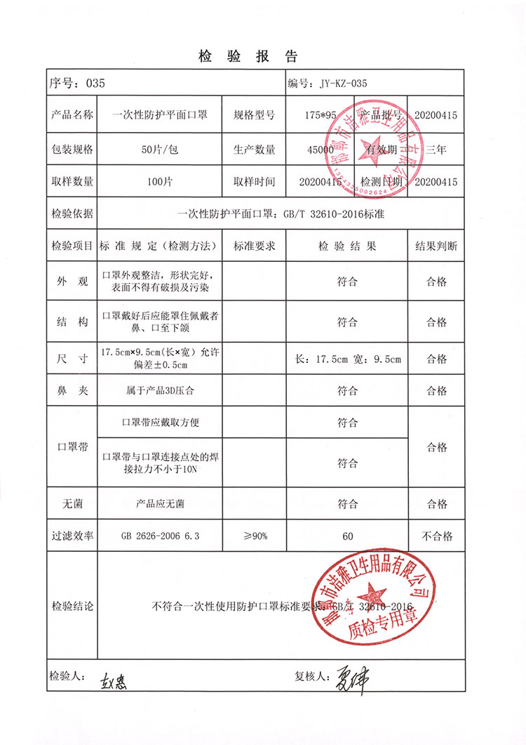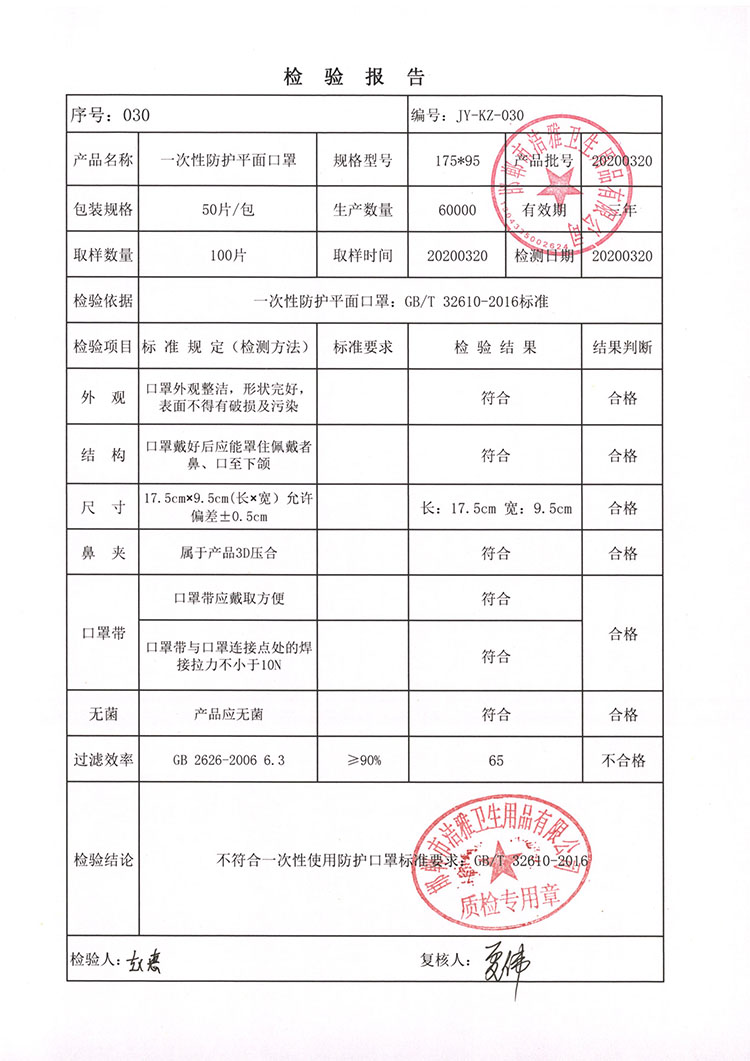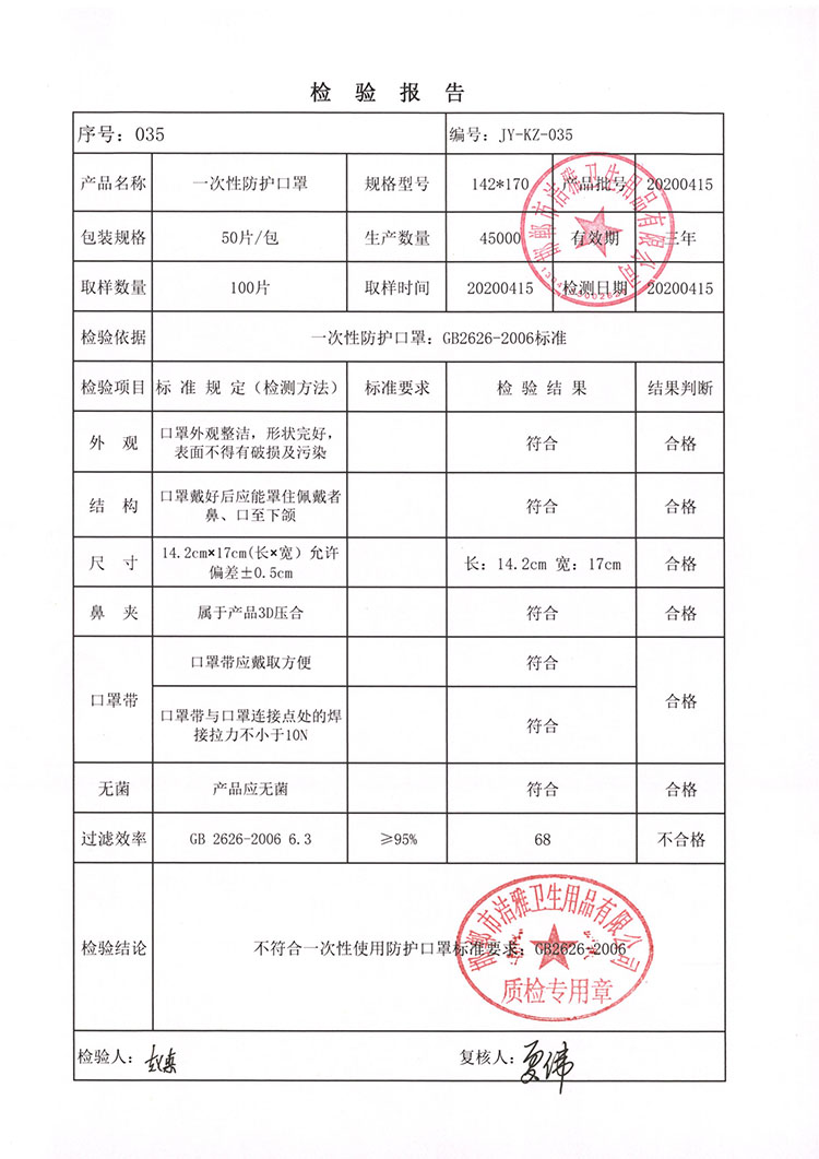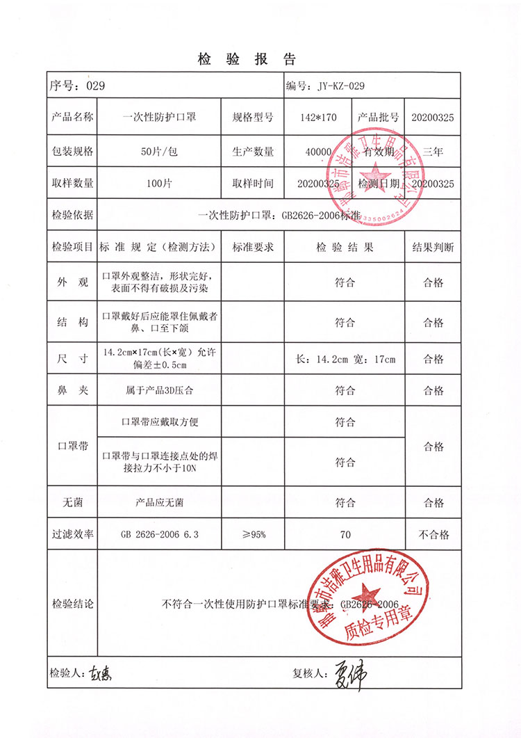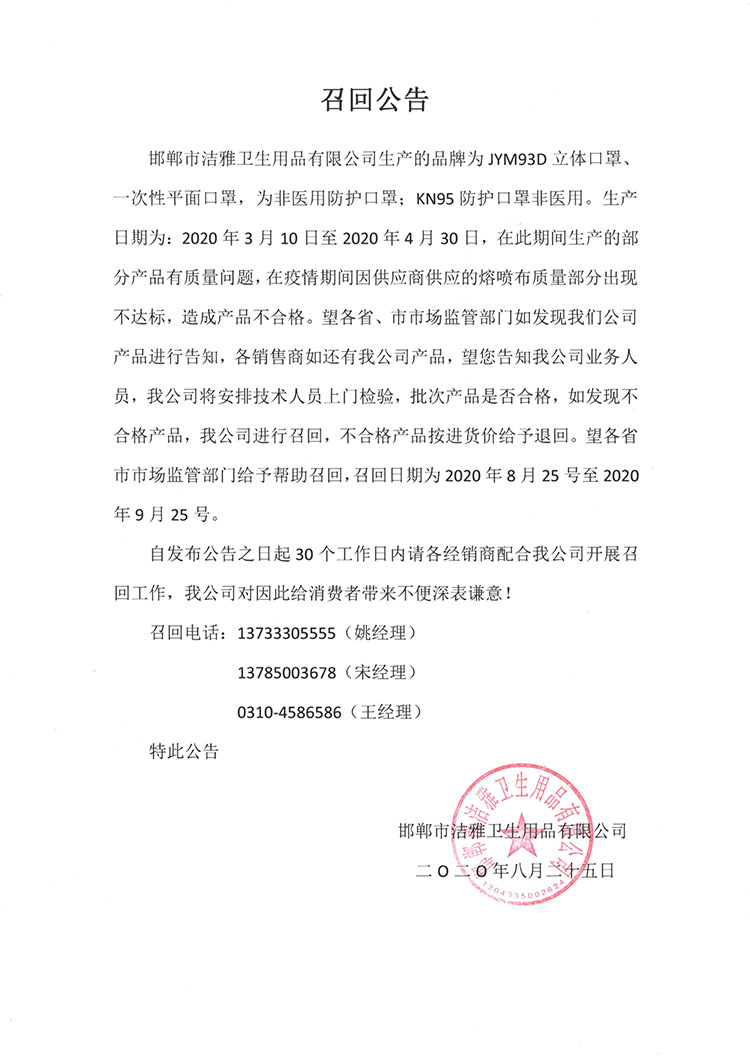 邯鄲市潔雅衛(wèi)生用品有限公司生產的品牌為JYM93D立體口罩一次性平面口罩,為非醫(yī)用防護口罩;KN95 防護口罩非醫(yī)用。生產日期為:2020年3月10日至2020年4月30日,在此期間生產的部分產品有質量問題,在疫情期間因供應商供應的熔噴布質量部分出現(xiàn)不達標,造成產品不合格。望各省、市市場監(jiān)管部門如發(fā)現(xiàn)我們公司產品進行告知,各銷售商如還有我公司產品,望您告知我公司業(yè)務人員,我公司將安排技術人員上門檢驗,批次產品是否合格,如發(fā)現(xiàn)不合格產品,我公司進行召回,不合格產品按進貨價給予退回。望各省市市場監(jiān)管部門給予幫助召回召回日期為2020年8月25號至2020年9月25號
